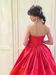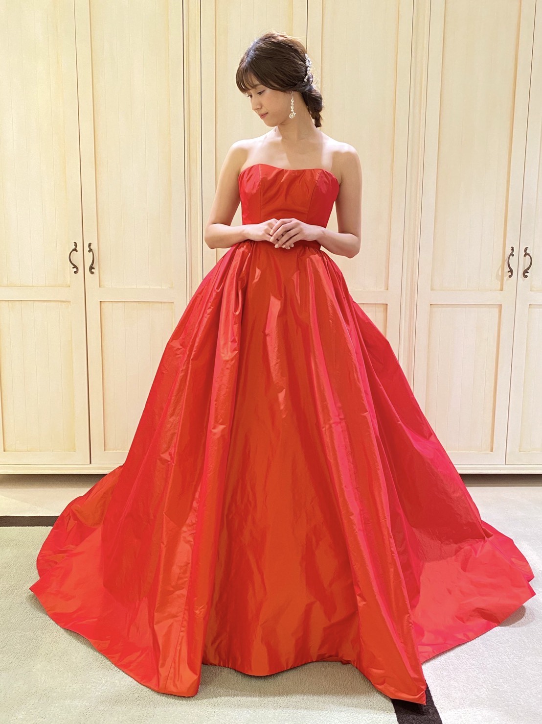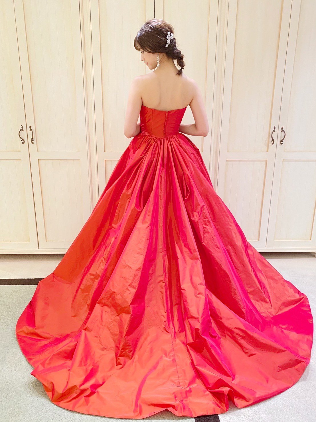 誰もが魅了される光沢感が美しいレッドのカラードレス。