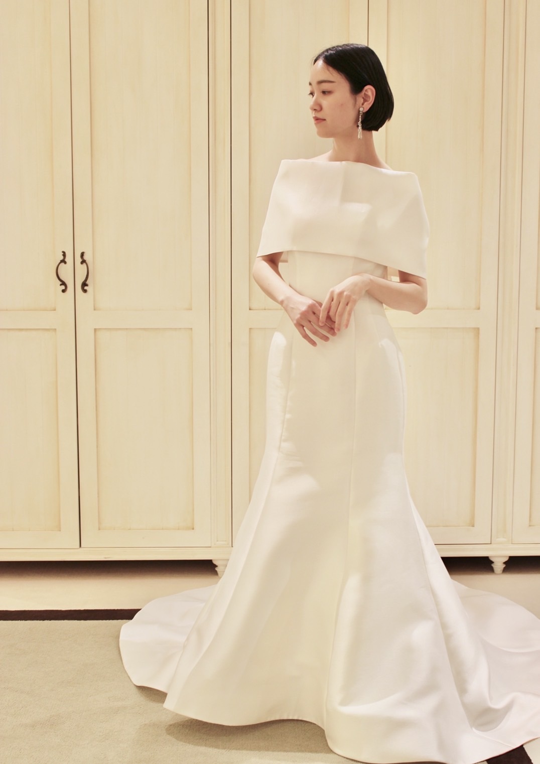 ヘアーはすっきりとまとめたスタイルがよりクラシカルな印象に。