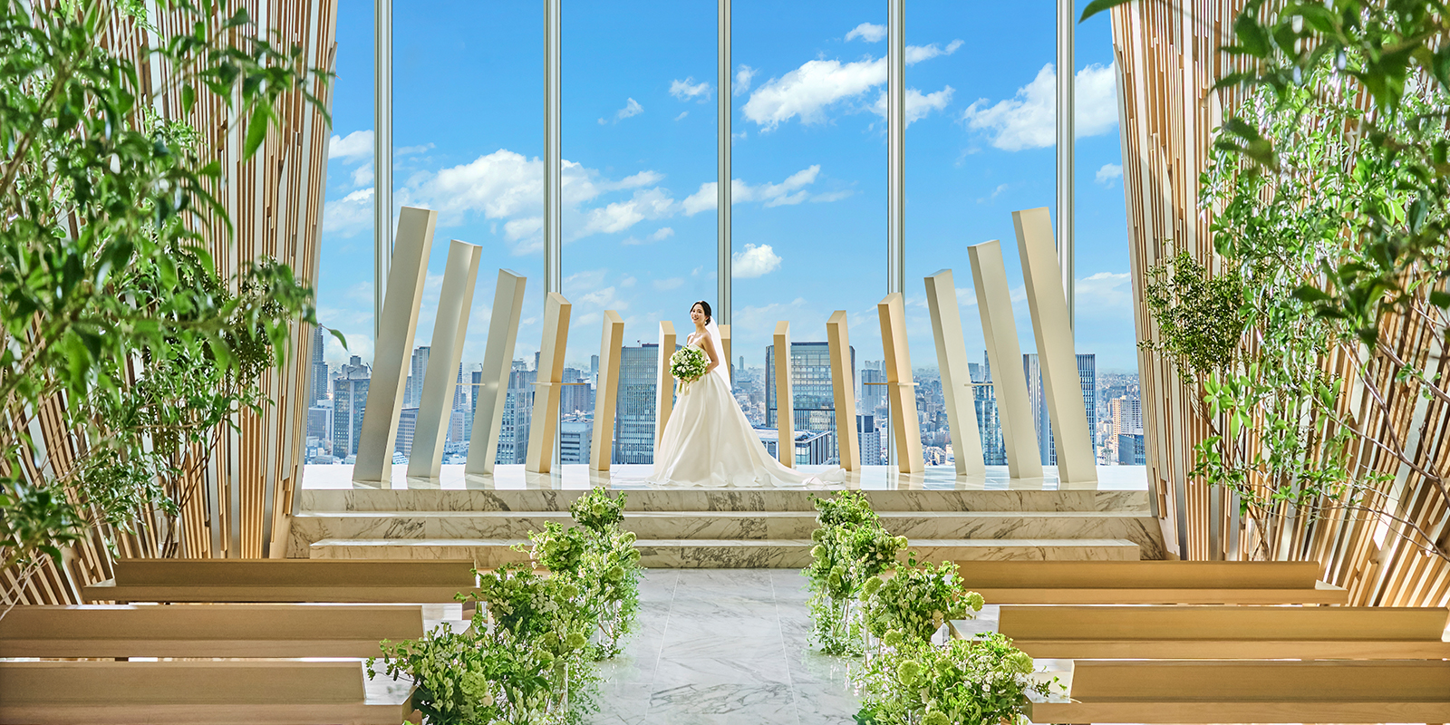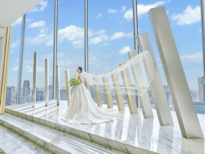 上空160m、大空に向かって開かれたThe 33 Sense of Wedding。空と光が祝福する天空のチャペルでは、印象的なアートウォールや大理石のバージンロードなど上質で洗練された空間と、大きな窓の先に広がる絶景が魅力。大空とまばゆい光に包まれた、感動のセレモニーを叶えることが出来ます。