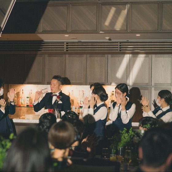 あとは、挙式のときに新郎があとから登場したり、新郎新婦が歌いながら、ゲストをお出迎えしたり、お色直しの入場の際に新郎がバーカウンターでバイトしている演出をしたり、、、