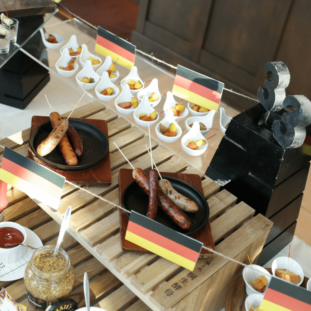 私たち夫婦は ドイツに縁があったためウェルカムラウンジにてドイツを連想するソーセージを数種類使用したオリジナルのウエルカムカナッペを用意しました