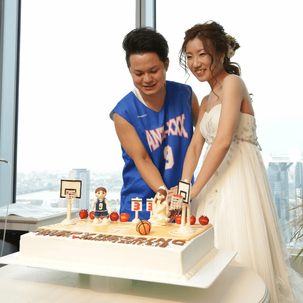 また 彼がバスケが好きで 今でも続けているので ウェディングケーキのデザインもこだわりました