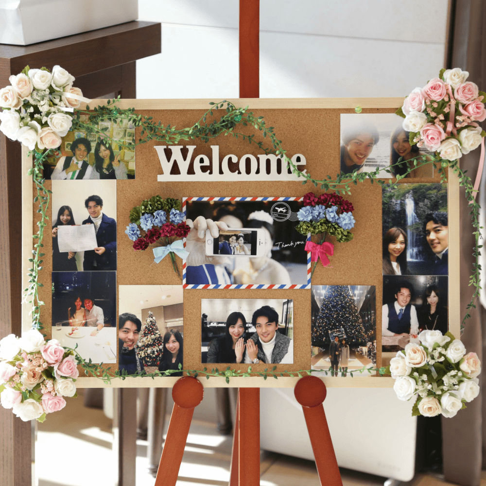 前撮り写真でドラマのワンシーンのような写真をたくさん撮っていただいたので 待合スペース等ゲストの目につく所にたくさん飾りました