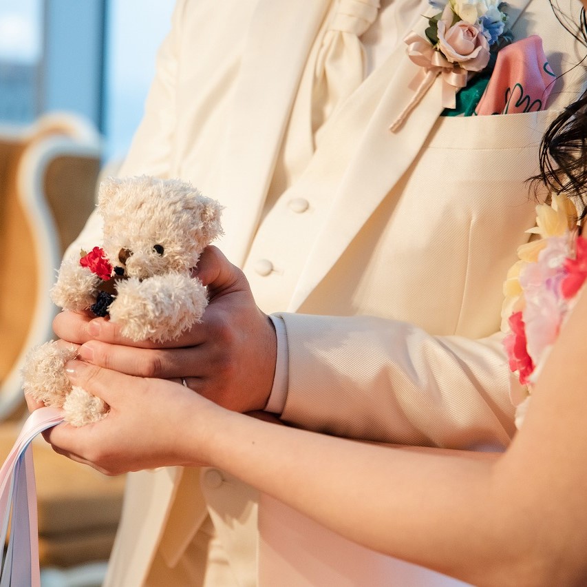お祝い事にふさわしいクマを飾ったり、ブーケプルズならぬクマプルズをして