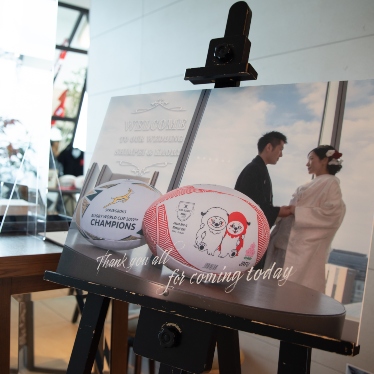 また、ケーキ入刀の前にラグビーボール型の特製ケーキプレートを準備していただき、