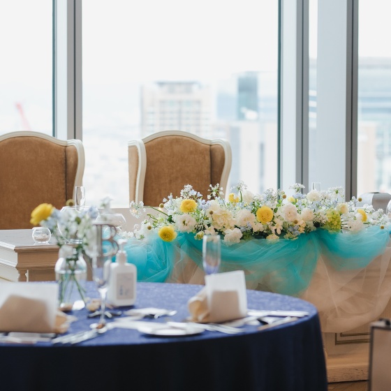 会場の雰囲気が海になるようにテーブルクロスやナフキンの色と形