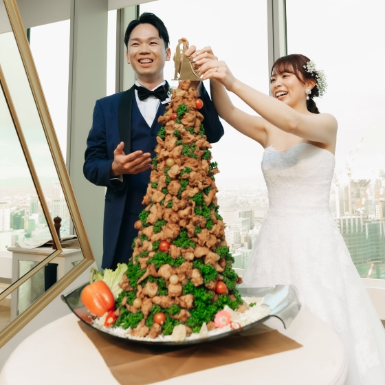 ケーキ入刀の代わりに新郎の大好物の唐揚げをタワーにしゲストには驚きと笑いの声が溢れました