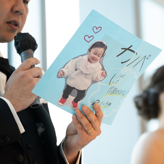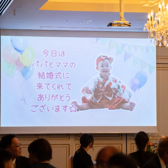 チャペル、入場時、エンドロールは式場で提示していただいたものの中から選び、プロフィールムービーは子どもがいたこともあり、子どもメインのものに出来たらと思い外部で頼んで制作しました。音楽もゲストの方が楽しめたり、私たちがどうしても流したいものや思い出のものなどを選びました。ゲームは全員参加型でゲストの方全員が楽しめるものが良かったので、どんなものが良いのか悩みに悩んで「わたしが1番ゲーム」にしました。この中でわたしが1番ものまねが上手いと思う人などを聞き、挙手制で前に出てきてもらいゲストの方の前で披露しゲストの方に誰が1番か決めてもらい、景品を渡すというものです。最後には新郎新婦とゲストの方全員でじゃんけんをし、勝ち残った方に景品を渡しました。