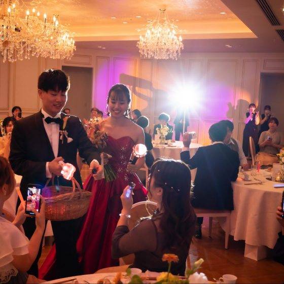 ライブのチケット風のエスコートカードを作ったり、ドレス当てクイズでペンライトを使用、披露宴入場後にクラッカーをみんなで一斉に鳴らし銀テープをイメージしました。