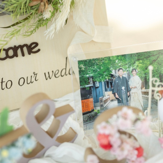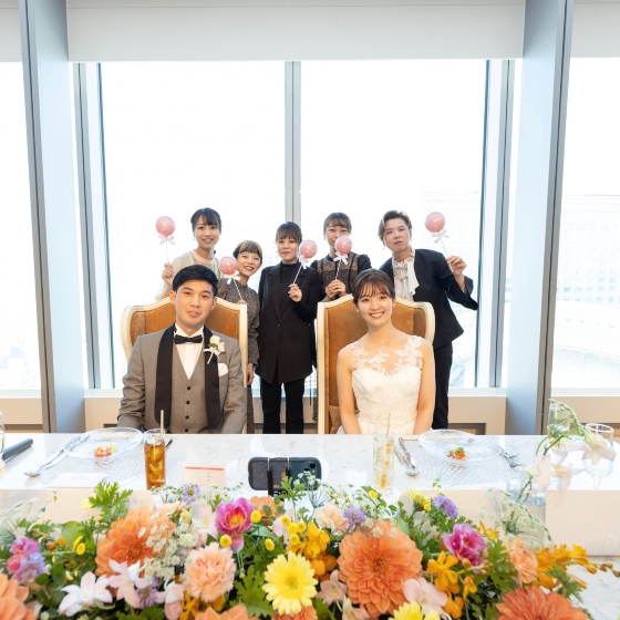 披露宴ではフラワーブュッフェで式場をゲストと共に飾りつけ、ゲストと話す時間をたくさんとってもらえるようにしました。待合ラウンジには家族や友人との写真をたくさん飾っていただき、中座のタイミングで来てくれた皆んなに手紙を配るなど、自分たちとの思い出を振り返り、自分たちの思いを伝えることができました。 テーブルに置いた名前入りバルーンもこだわりポイントです!