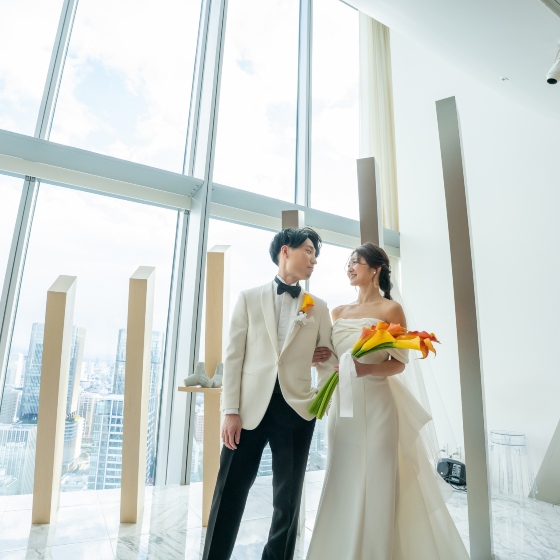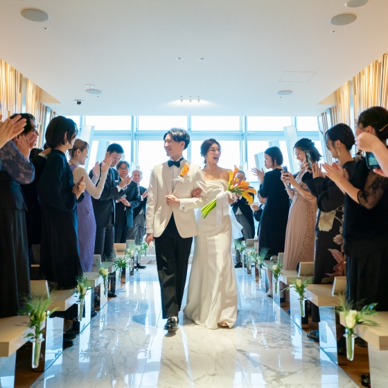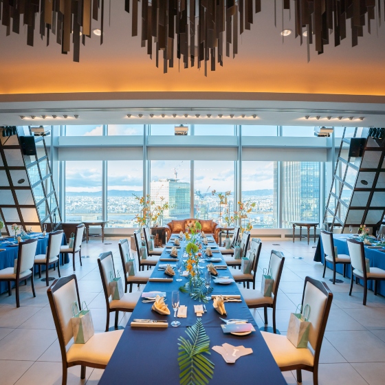 チャペルからの景色やバンケットのカーテンを開ける演出など、高層階であるところを活かせるのも良かったです。夕方からのスタートでしたが、天気にも恵まれ、