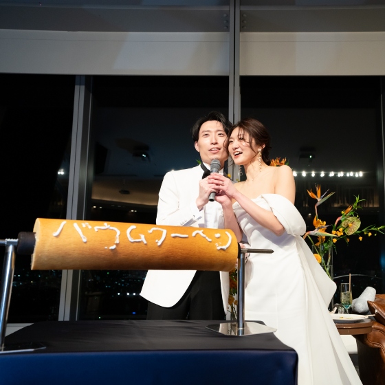また、式では事前告知ほぼなしの親族友人インタビューや、ケーキ入刀ならぬバウム入ペン、新郎新婦にまつわるクイズ大会など、たくさんの企画を考えました。