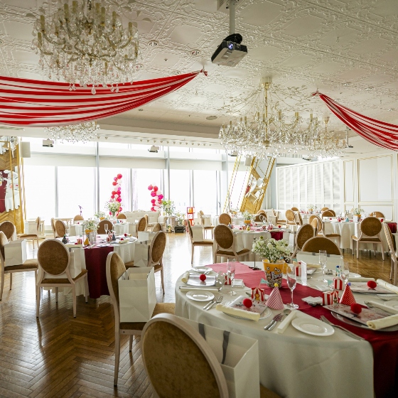 披露宴会場には天井から赤と白の布を垂らしたり、高砂にはバルーンアーチを設置、ゲスト席にはピエロの鼻やパーティ帽子を置いたり、これから始まる披露宴にワクワクする様な装飾にしました。