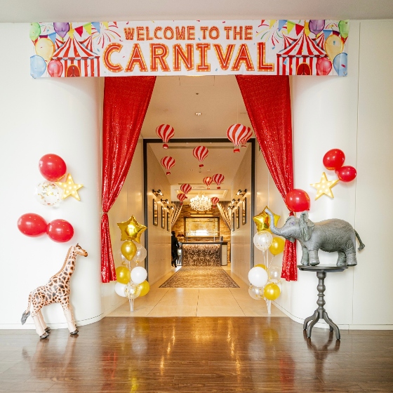 エントランスは赤のカーテンや星のライト、ゾウやキリンの置物、風船でサーカス感を全面に出して、受付の方にはピエロの格好をしてもらい、ゲストの方が来てすぐに楽しいと思える空間を作りました。