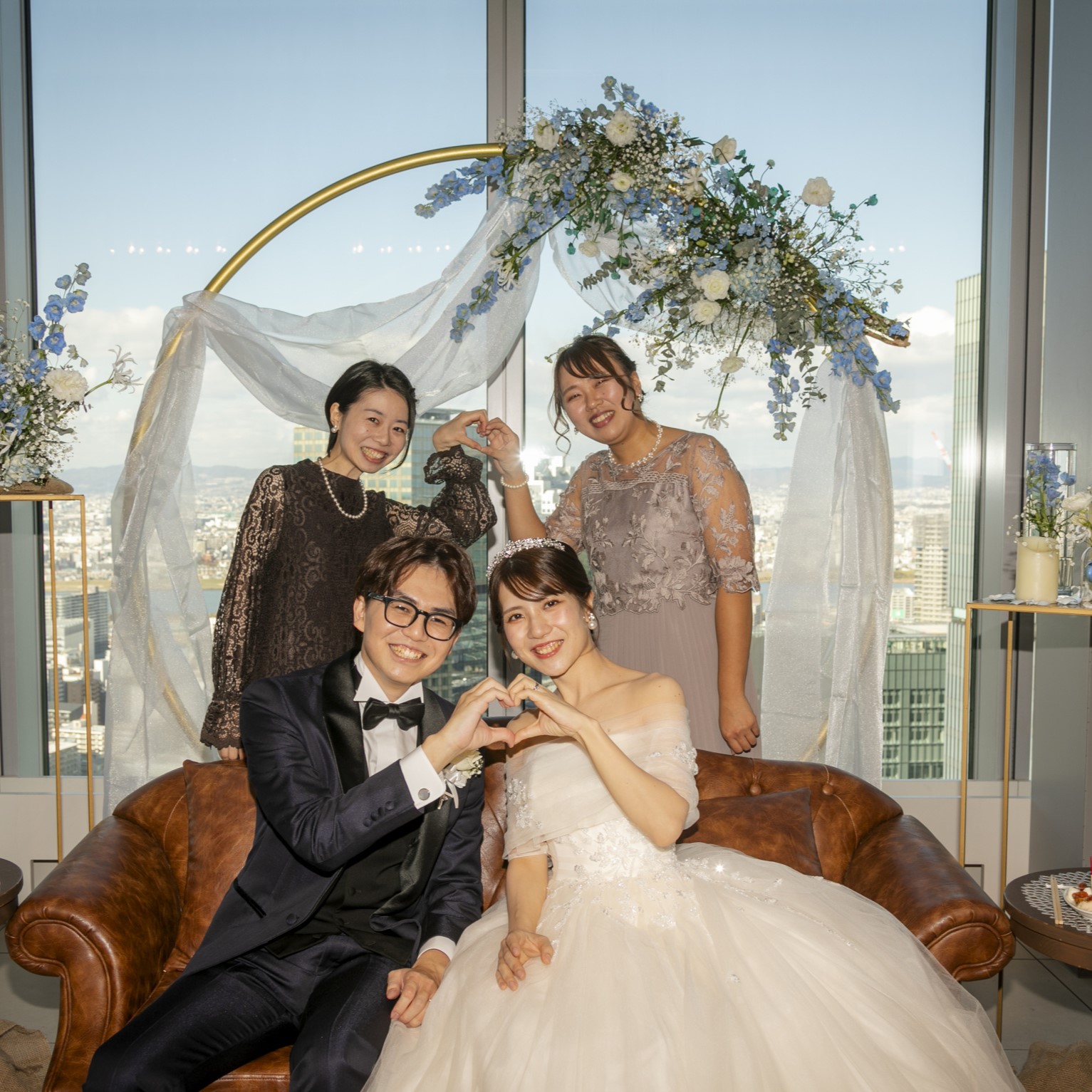 披露宴会場の高砂をソファーにしてドレス全体がみれ、出席者との距離を近く感じられたこと。