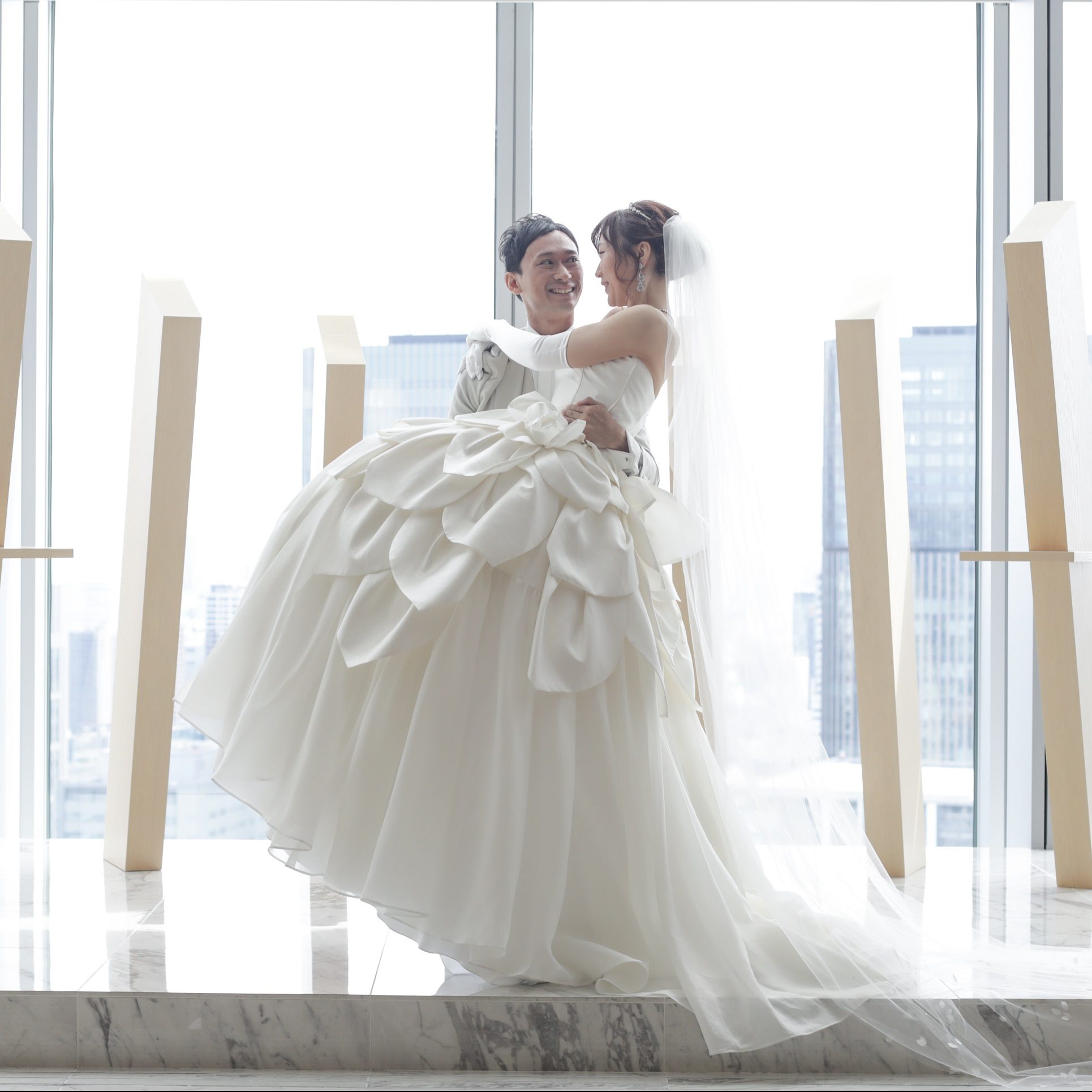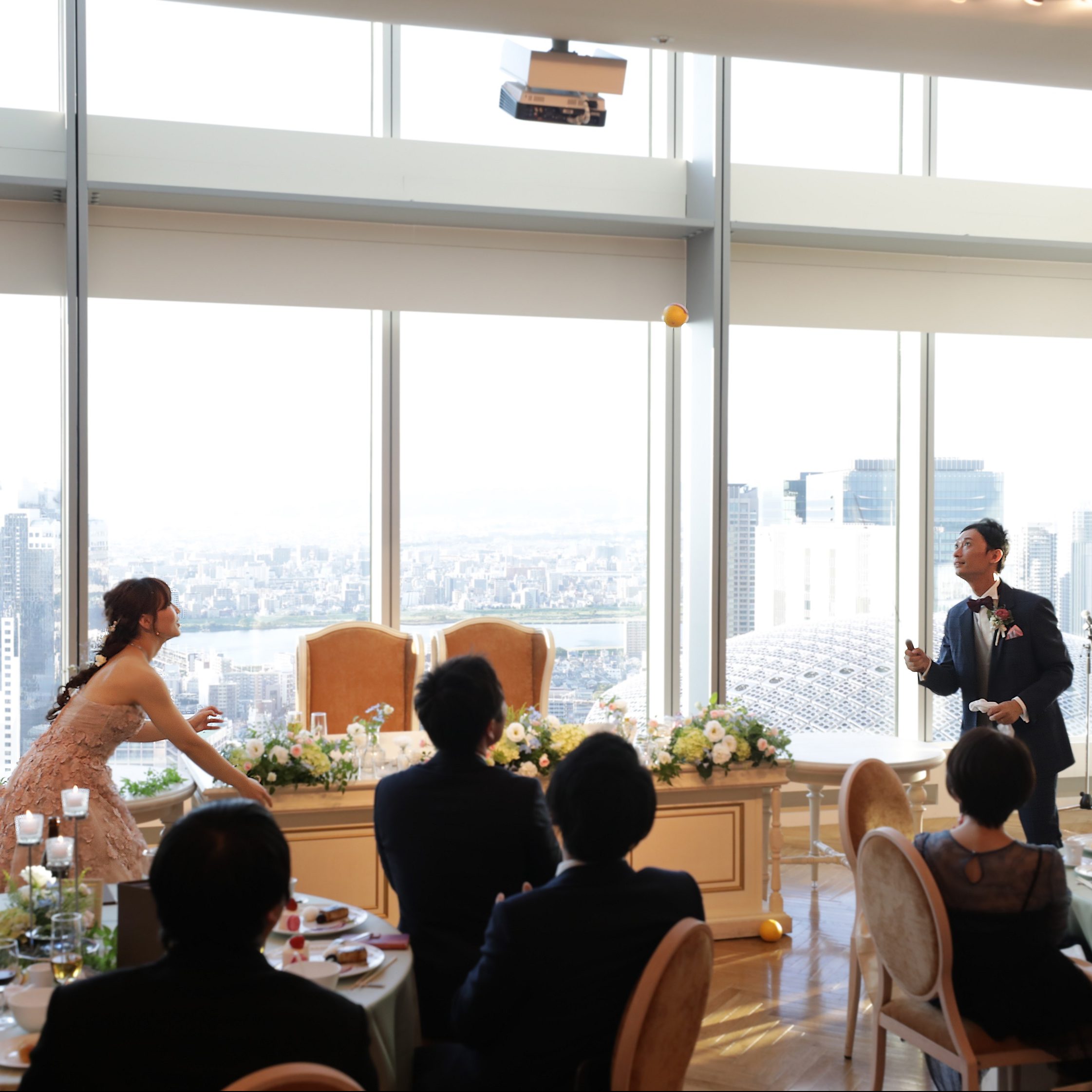 そして、33階というロケーション!大阪の街を一望できる絶景と、空をとても近くに感じることができます。それら一面をガラス越しに見渡せることができるので、ゲストの方もわたしたちも、空中で結婚式を挙げているような感覚に陥りました!タイミングに合わせて、景色を覆っていたカーテンを開ける演出も鳥肌ものでした!