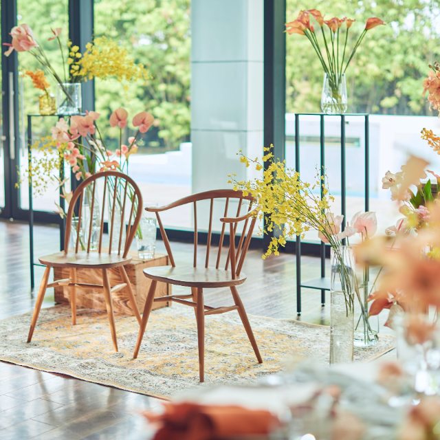 優しいオフホワイトと、格子模様のモダンな木目が洗練された印象を与える「アクア」。一面のガラス窓から差し込む光が柔らかなムードを創り出し、おふたりのパーティーをあたたかく包み込みます。シンプルモダンな空間は、おふたりのテーマウエディングに合わせた様々なコーディネートが可能です。
