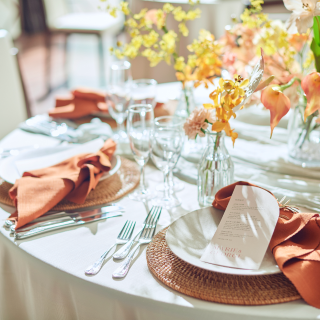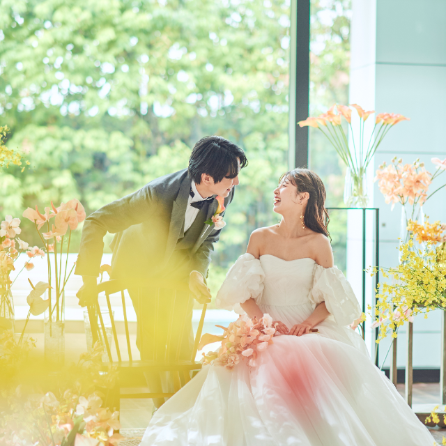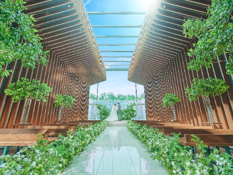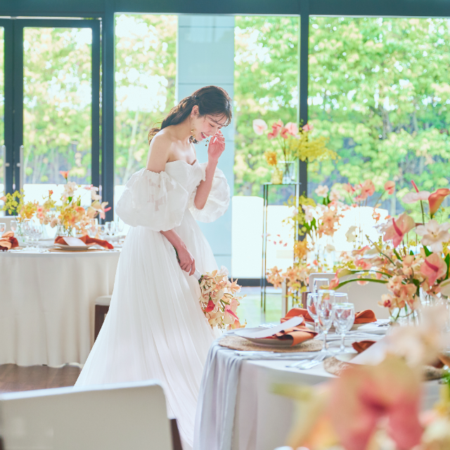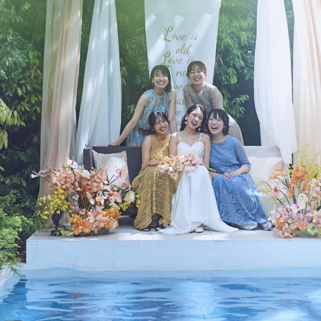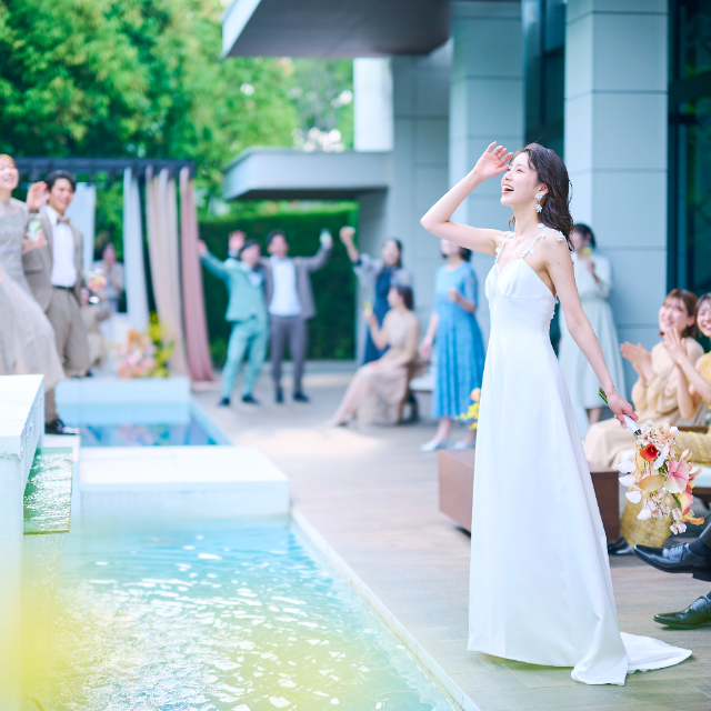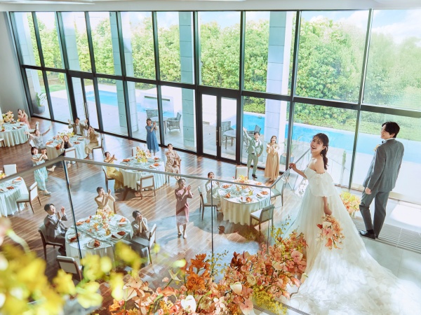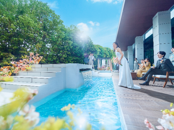 ガラス窓の向こうに広がるのは、プールを備えた開放的なガーデン。青空の下で緑と水が美しくきらめき、リゾートウエディングのような開放的なひとときをお愉しみいただけます。水辺でのカジュアルな歓談タイムはもちろん、水上ステージからのサプライズ入場やガーデンを使ったデザートビュッフェもおすすめです。