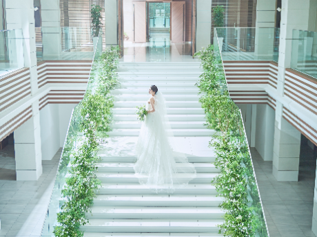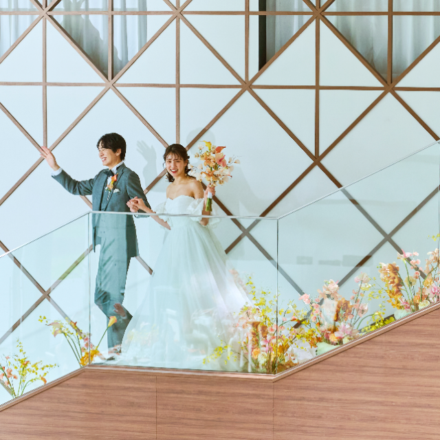 テラスでのバルーンリリースをはじめとした演出はもちろん、バンケットにはどの席からも見やすい三面スクリーン、壁一面に映し出せるプロジェクションマッピングなど、パーティを盛り上げる充実の設備をご用意しています。また、オリジナルドリンクをサーブできるバーカウンターや入場シーンに使える階段もあり、おふたりらしい演出を形にできます。