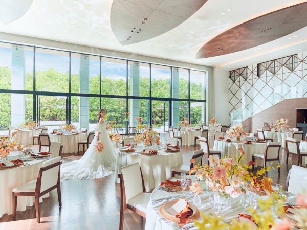 壁一面の大きなガラス窓からガーデンの風景を取り込む、ナチュラルモダンなバンケット。プール付きのリゾートフルなガーデンを自由に使い、リラックス感あふれる、心地よいパーティをお愉しみいただけます。