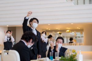 サーモグラフィー&アルコールの完備、ソーシャルディスタンスを考えた席次配置