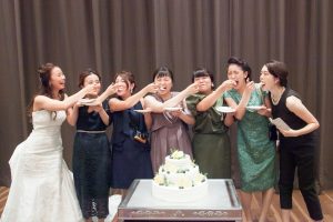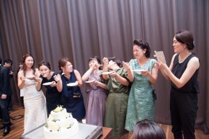 見たことのない演出をと、ご新婦様の仕掛けた大人数ケーキバイト。