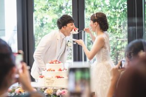 新郎新婦様がお互いにケーキを食べさせ合うシーンですが