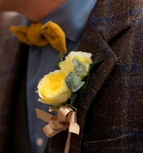 ご新郎様の胸元のブートニアもご新婦様と同じお花を使って合わせたコーディネートに♪
