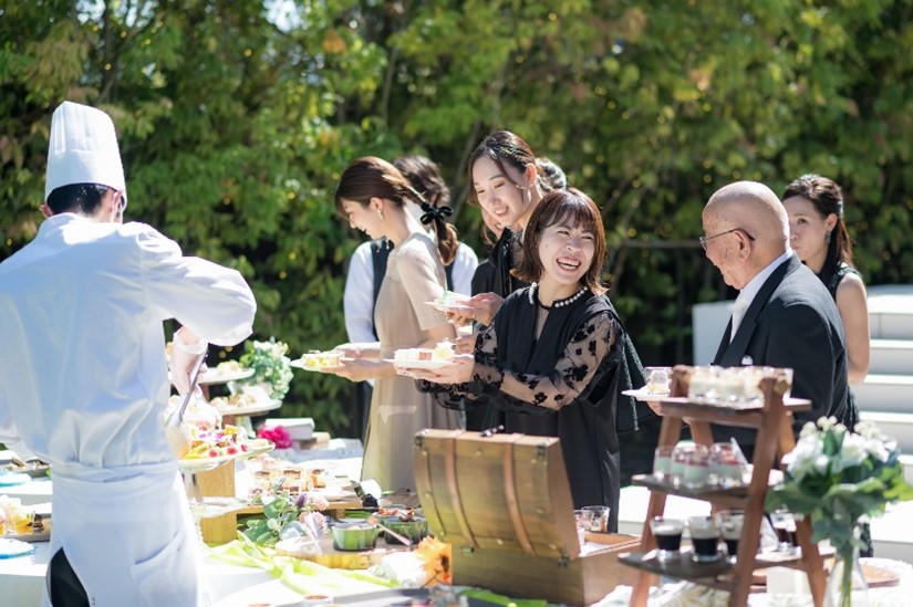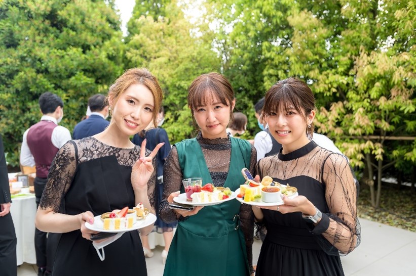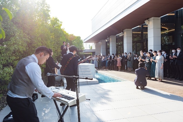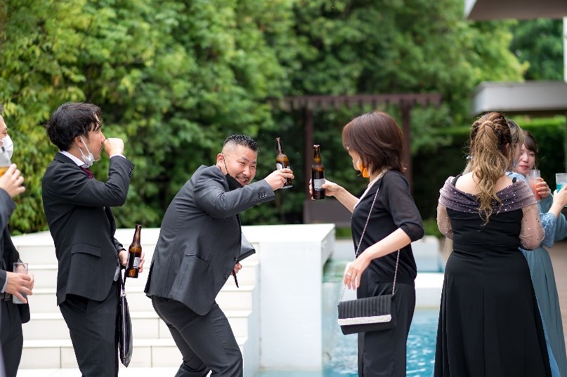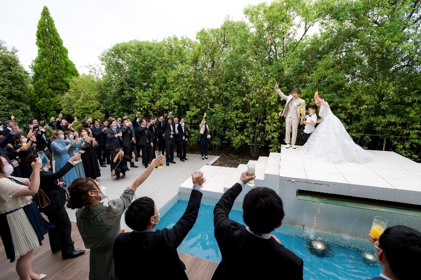 開放的なガーデンにゲスト全員を招いて「乾杯!」