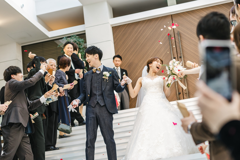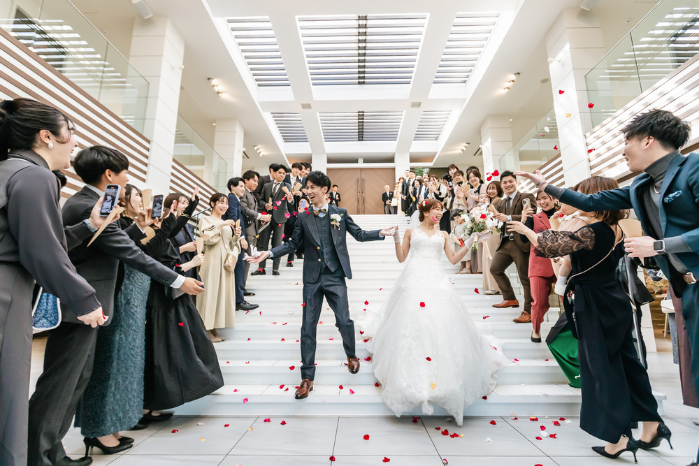 挙式後は、当会場の大階段にてフラワーシャワーなどの
