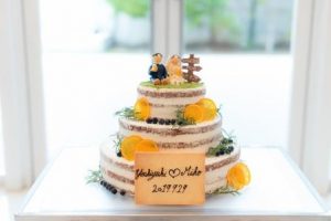 流行のネイキッドケーキにおふたりの人形を乗せて…