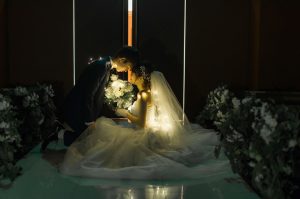 チャペル内を暗くして、おふたりにライトを巻いて幻想的な1枚に。