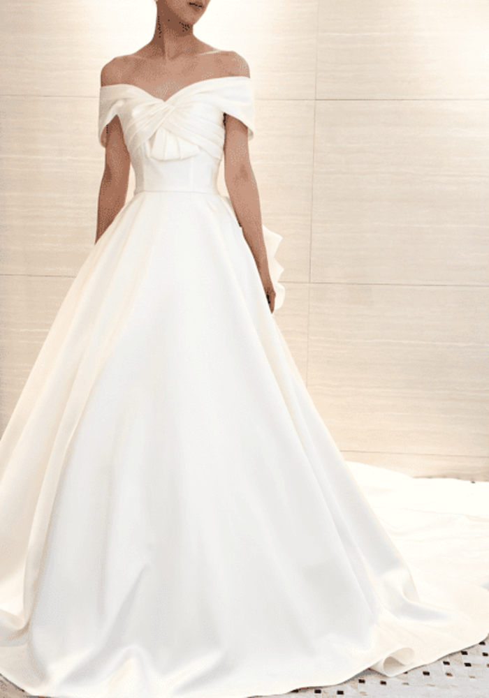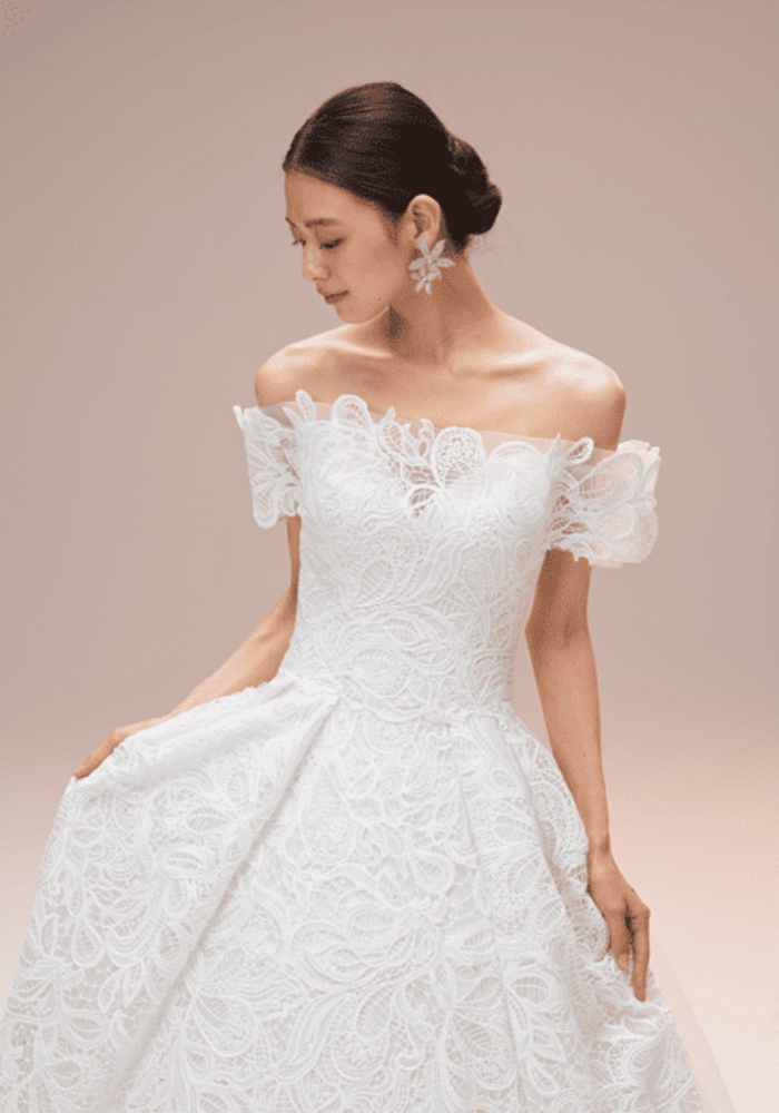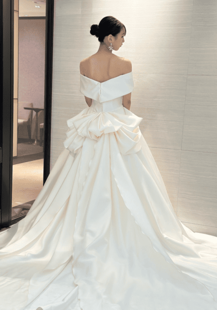 後ろにかけてなだらかに幅を広げたオフショルダーや、