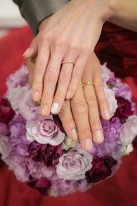 その上に合わせたおふたりの手。輝くリングも印象的です♡