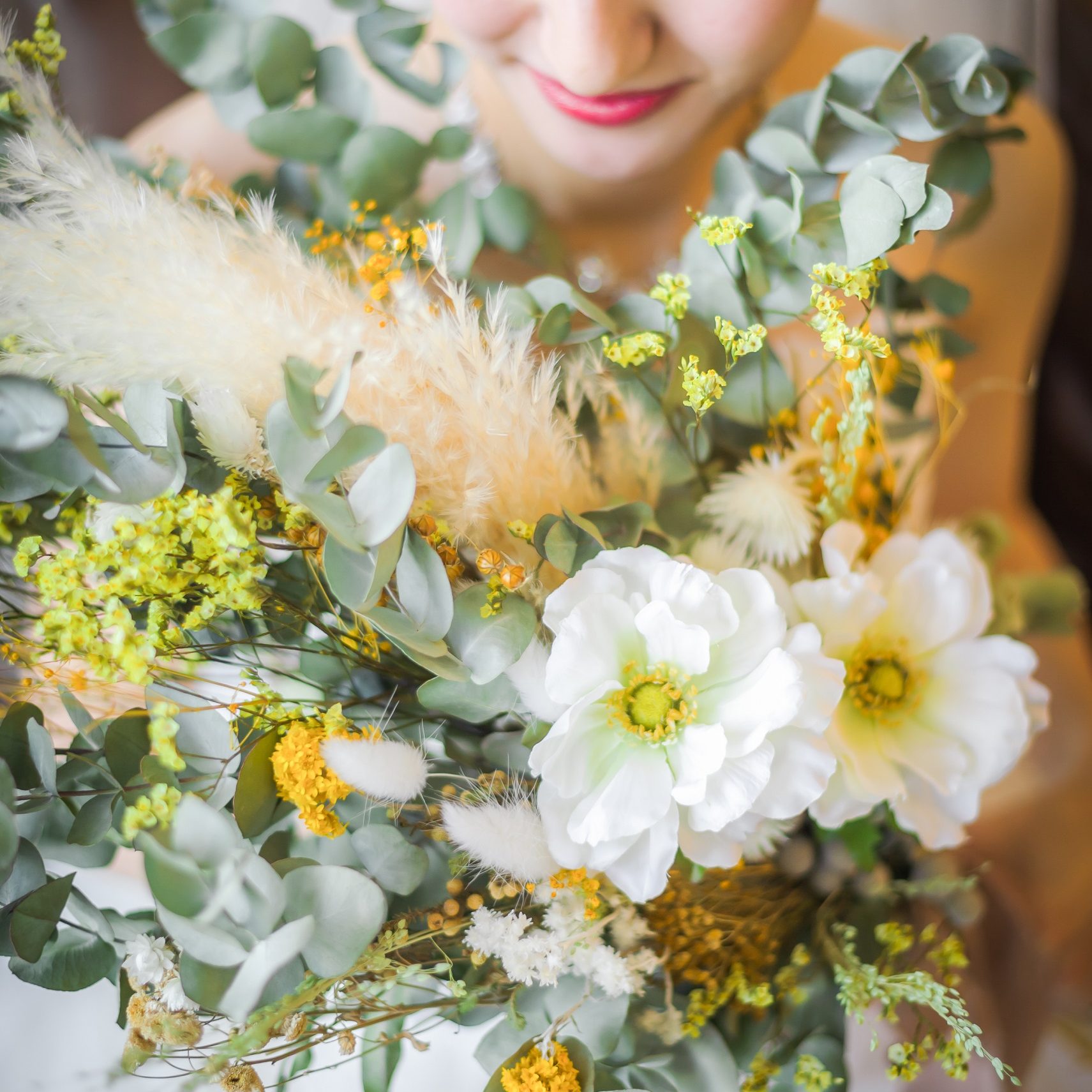 こちらの、おしゃれなブーケにはたくさんの【ユーカリ】の葉 そして、中央には【パンパスグラス】という草花が...