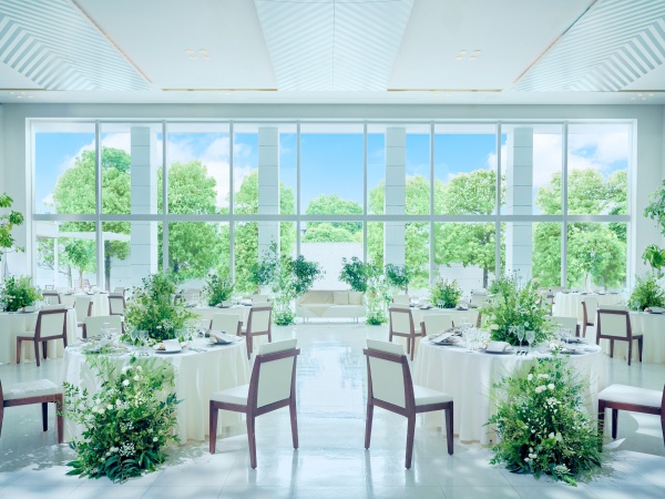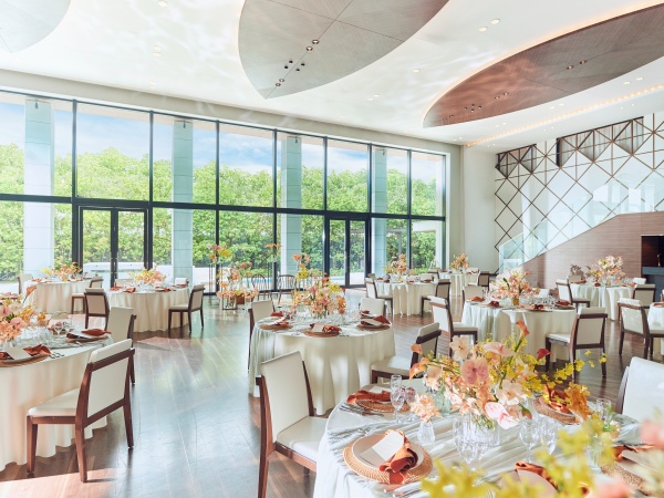 館内はどんな気候でもご利用いただける全天候型でありながら、一面の窓が開放的なバンケットが魅力。まるで光を集めたように明るく洗練された空間が、パーティーを華やかに彩ります。また迫力のある映像演出や緑豊かなガーデンからのサプライズ入場、自然光を取り込む大階段でのフラワーシャワーなど、多彩な演出とリラックスしたひと時をお過ごしください。