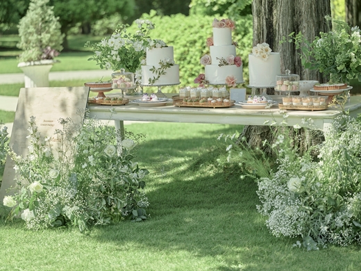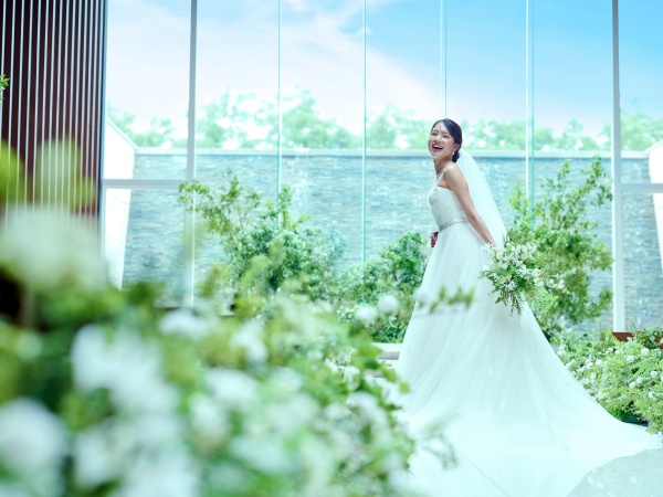 また迫力のある映像演出や緑豊かなガーデンからのサプライズ入場、自然光を取り込む大階段でのフラワーシャワーなど、多彩な演出とリラックスしたひと時をお過ごしください。