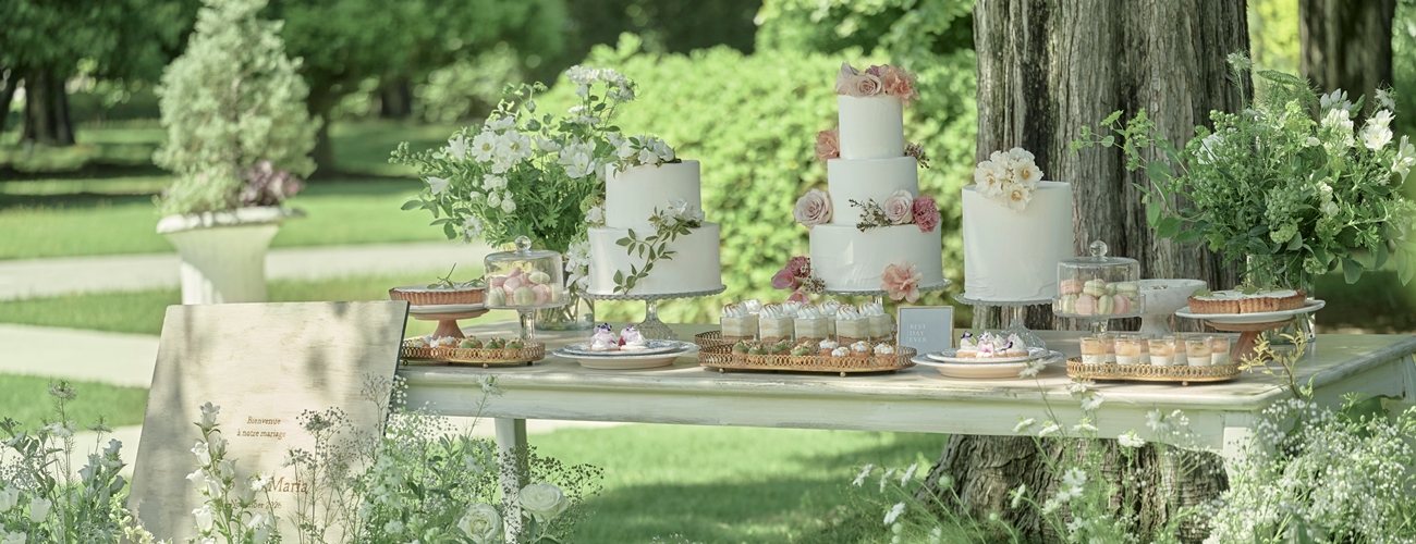 ザ・リーヴス プレミアムテラスでは、オリジナルのウエディングケーキやデザート、そしてゲストへのうれしいサプライズとなるデザートブッフェをご用意しております。色とりどりのケーキ&スイーツが奏でる幸せな時間を、どうぞお愉しみください。