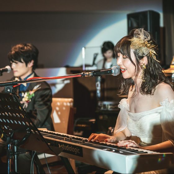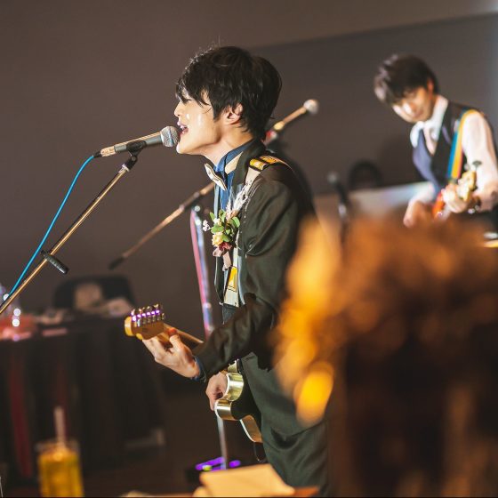 披露宴では、新郎の影アナウンスからスタートに挑戦したり、本来始まりで使う事の多いプロジェクションマッピングを中盤で使ったり、後半には新郎のバンド演奏があったり、とゲストの皆様に楽しんで頂けるような内容を盛り込みました。実際、ゲストの皆様の楽しそうな笑顔をたくさん見る事ができ嬉しかったです。