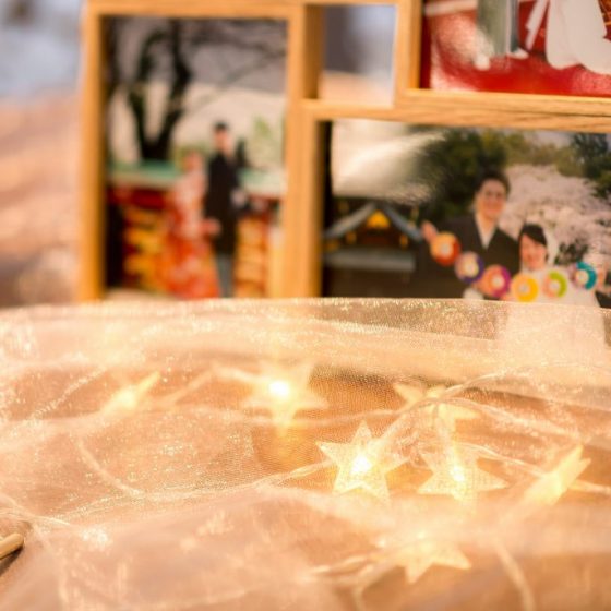 また、お互いが好きな『星』をテーマに決め、フラワーシャワーではなく手作りのスターシャワーにしました。会場の色んなところに星のアイテムを置いたり、演出の中でも夜空のようなライトを使用し、パーティー全体で統一感を持たせることが出来ました。手作りアイテムを持ち込めるのも良かったです!ウェルカムスペースには、ゲストの皆様からお祝いとして頂いたプレゼントも飾ることが出来たので、喜んで頂けて良かったです。