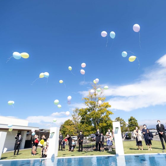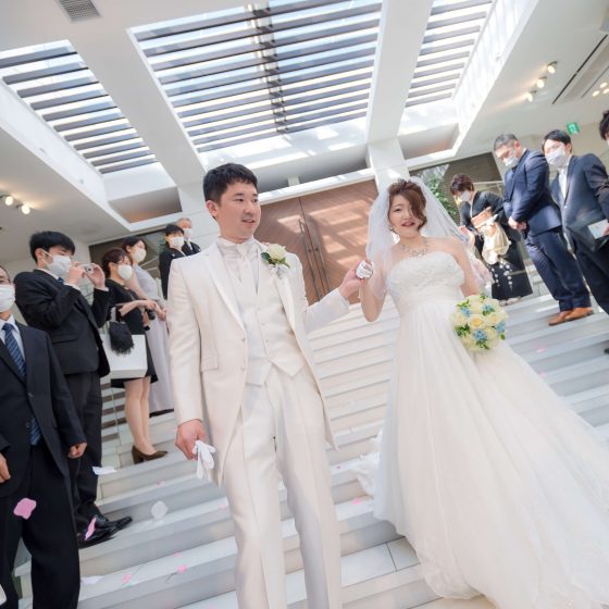 コロナ禍の中、集まっていただいたゲストの皆様、親族の皆様、ザ・リーヴスプレミアムテラスのスタッフの方々には感謝に気持ちでいっぱいです。約2年前から計画し、1年延期になり、途中心折れることもありましたが、瀧澤さんをはじめリーヴスの方々のおかげで無事終えることができました。リーヴスに打ち合わせに行っていた頃、生まれて数ヶ月の娘も、結婚式当日は披露宴の再入場で一緒に歩けるほど成長していました。当日は始まる前から、感無量で新婦の手紙のときは涙が止まりませんでした。またこだわりがあったBGMや料理、アクアパーティ、バルーンリリースなどゲストの方にも喜んでいただけたんではないかと思います!周りの方、リーヴスのスタッフの皆様など、たくさんの方々に支えてもらい1年の延期、約2年越しの挙式、披露宴を挙げることができ、一生の思い出になりました。