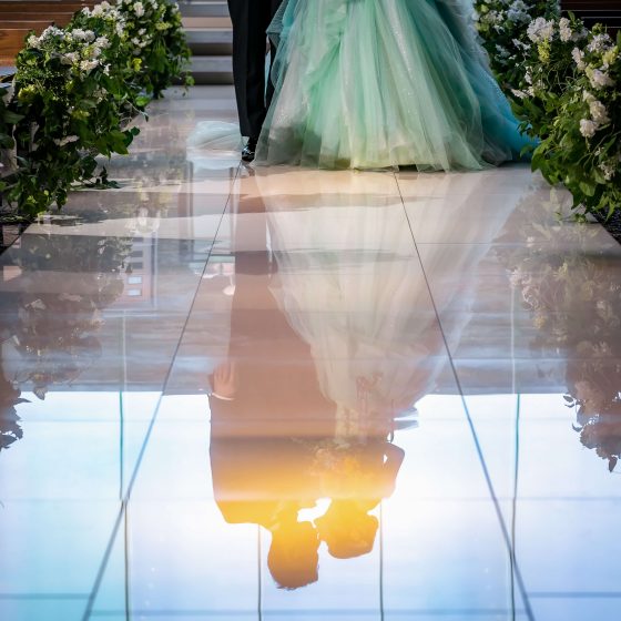 外観の水がきれいな入り口にまず最初に惹かれました。チャペルの開放的なガラス張りのところ、プロジェクションマッピングを見たとき、まるでテーマパークのような演出をこの大きなマッピングで、一生に一度の披露宴・挙式をやりたいと思いました!結婚式場を探してた時、開放感があって自然あふれる式場で結婚式がやりたく、ネットで見た時から第一候補になりました。友人が挙げていた式場に実は既に予約をとっていたのですが、それをキャンセルしてリーヴスに決めました。最初に見学させて頂いたときも子供が小さいにも関わらず、優しく丁寧に式場の説明をしてくれたこと、料理が美味しかったこと、2人で「ここでやりたい!」と決意し、その場で契約を致しました。