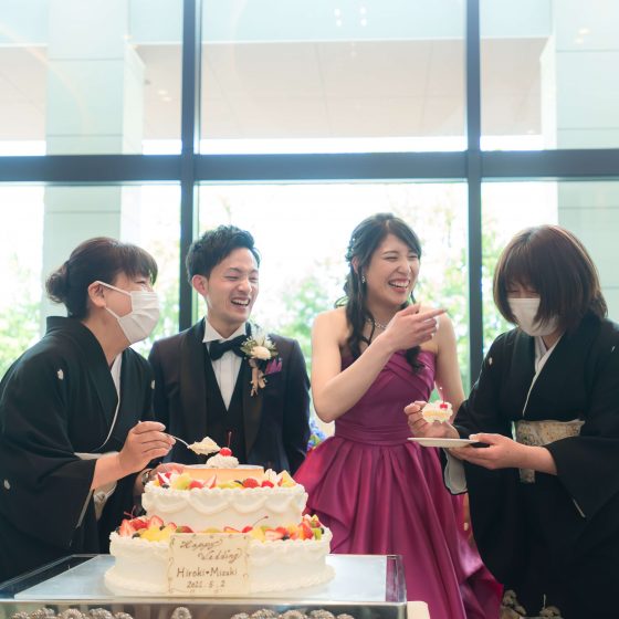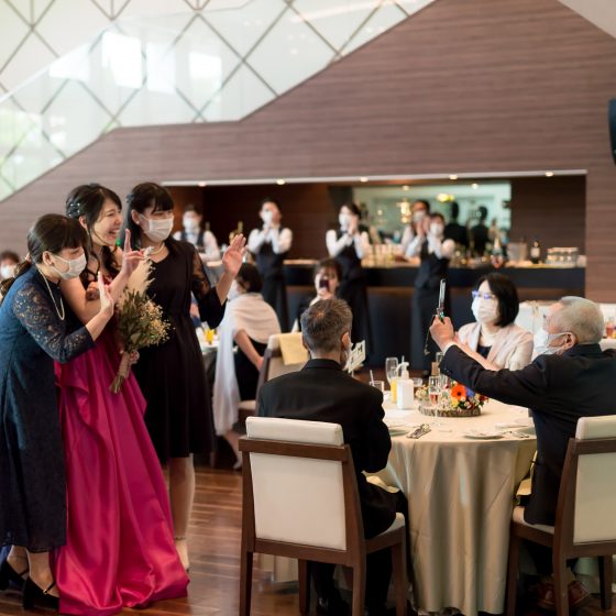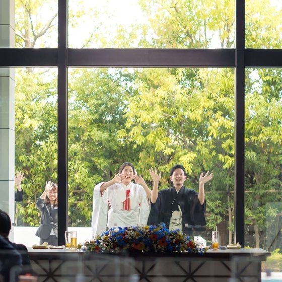 披露宴では、入場後に会場内の大きなカーテンが開き、会場内が一気に自然光で明るくなった瞬間、ゲストの皆様からの感嘆の声が上がったのをよく覚えています。その後もゲストととても楽しい時間を過ごすことができました。