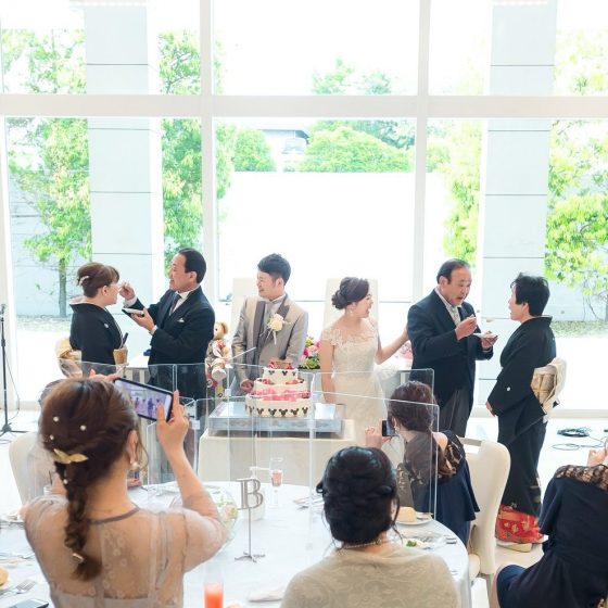 そして、コロナ禍ということもあり、披露宴会場にはアルコール消毒やパーテーションを設置してもらい、ゲストの皆様に少しでも安心して過ごしていただけるよう準備しました。
