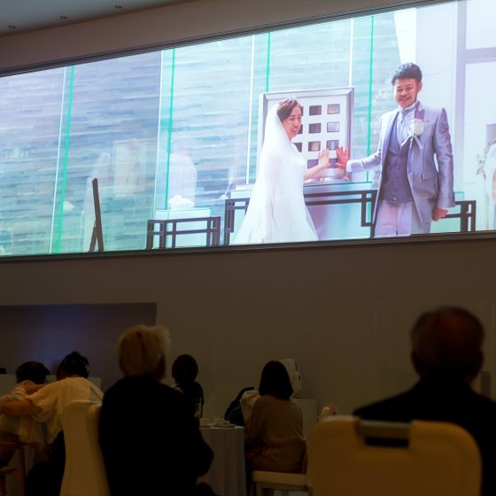 また、天気や気温などに左右されない全天候型という点や全館バリアフリー設計となっている点、披露宴会場にある三面スクリーンや壁一面を使用した大画面での映像演出ができる点も魅力的でした。