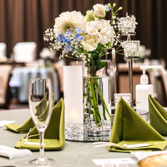 そこで2人にとっての初めての会場探しはリーヴスから初まりました。リーヴスに到着した時の第一印象は白を基調とした外観、また、駐車場から式場に入る時の両側にあるとても透き通ったきれいな水面、どれも清潔感もあり私たちの理想にとてもマッチしていました。中に入ると、チャペル、披露宴会場ともに大きな窓がたくさんあり、太陽の光が差し込むと照明では味わえない自然光の暖かい温もりを感じながらとてもリラックスできる空間に一目惚れをしてここで結婚式をあげたい!と強く思い見学に行ったその日に決めさせていただきました。