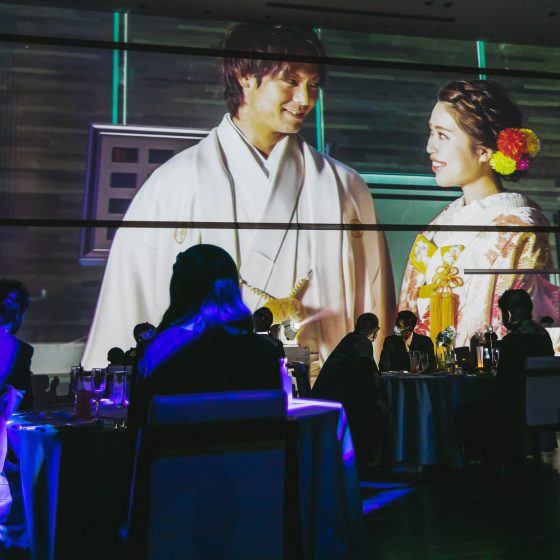 また演出面にもこだわり、新郎新婦入場の際、披露宴会場内をスモークでいっぱいにしたり、リーヴスの最新設備であるプロジェクションマッピングも使用させていただきました!