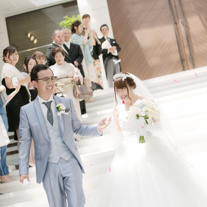 まず私たちの目をひいたのは、建物の綺麗さと明るさでした。チャペルに入ると高い天井から光が降り注ぎ、正面にある滝がキラキラと輝いており幻想的でした。二つある披露宴会場もそれぞれの特色がありましたが、私たちは明るさとガーデンの広さでテララを選ぶことにしました。そして、全天候型なところも気に入りました。ゲストは外に出ることなく移動できるところや、絶対にやりたかったフラワーシャワーも広い大階段で必ず行えます。万が一天気が悪くてもゲストにも不便な思いをさせず、私たちも悔いの残らない式になること間違いなし!と思いました。