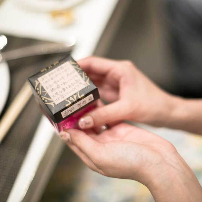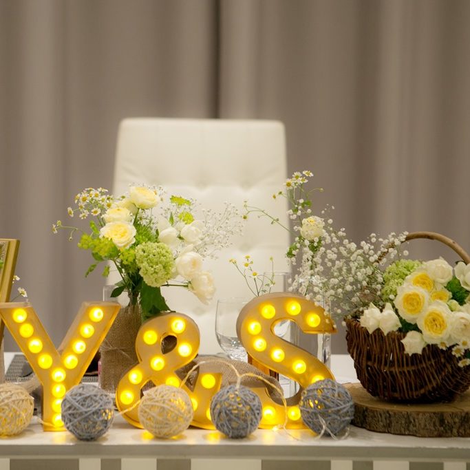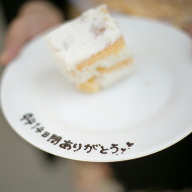 一つ目はウェルカムスペース、ペーペーアイテム、ムービー関係、髪飾りなど手作りをたくさんしたことです。中でも欅の木を彫ったウェルカムボードは新郎が時間をかけ作ったもので、存在感のあるものができました。また、披露宴時の小枝のアクセサリーやお色直し後の花冠とリースブーケもゲストに大変褒めていただき、とても嬉しかったです。手作りするのは時間もかかり大変でしたが、どれも思い入れのあるものができ、ふたりで協力して作れたところも良かったです。二つ目はお互いの母にサプライズをしたことです。私たちはファーストバイトをせず、“母からいただく最後の食事”を意味するラストバイト、“今まで美味しい食事をありがとう。たくさんの愛情をありがとう。”を意味するサンクスバイトを行いました。突然呼ばれた母たちは驚いて恥ずかしそうにしていましたがとても喜んでくれました。また、デザートビュッフェでは、ケーキのお皿に私たちが生まれてから結婚式までの日数とありがとうの文字をシェフに書いてもらい渡しました。なかなか普段言えない「ありがとう」をこういう形で伝えることができてよかったと思います。