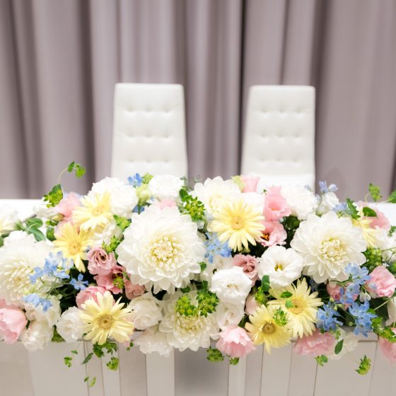 白が基調の会場だったのでテーブルの装飾はなるべく会場と同系色の物を選びました。当日は私たちが主役っていうこともあり、私達がいちばん目立てるようにです(笑)